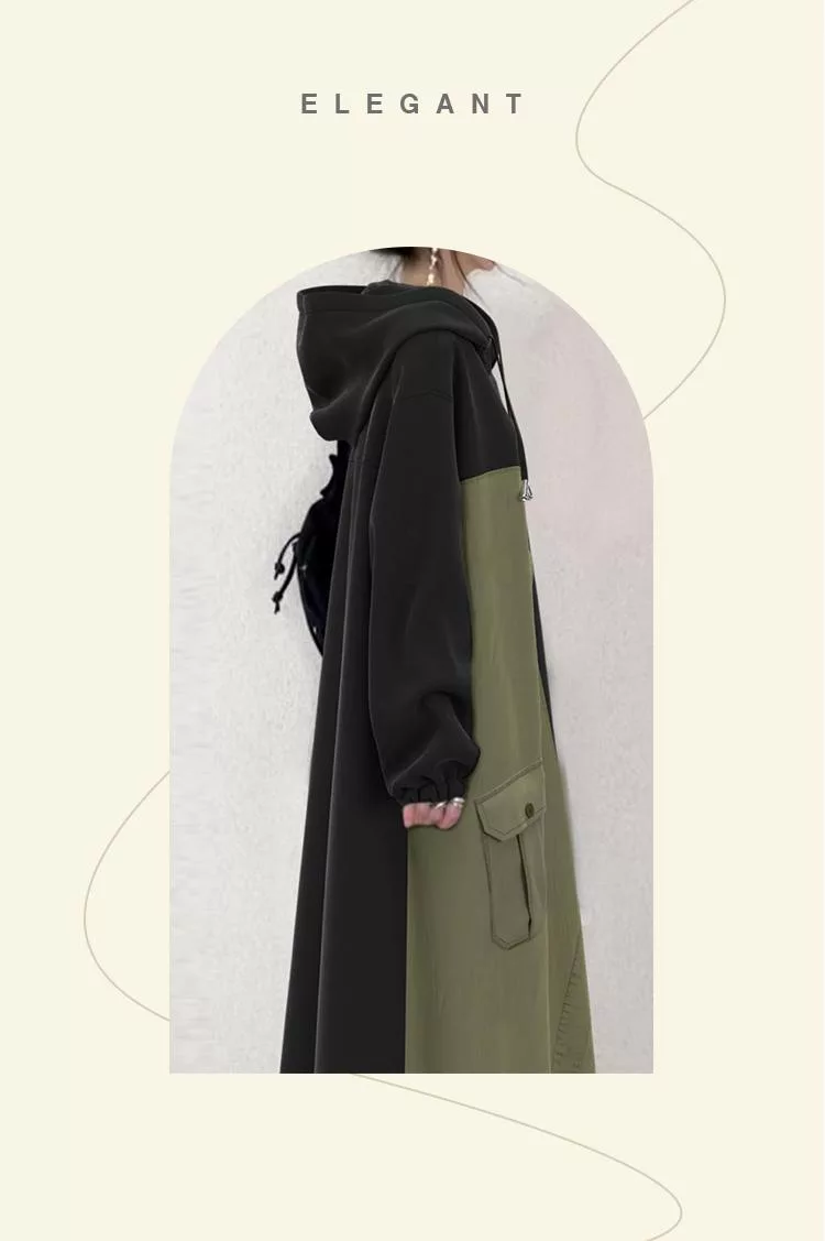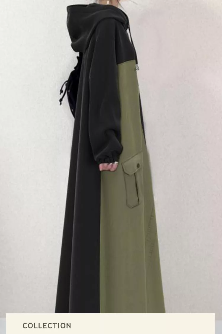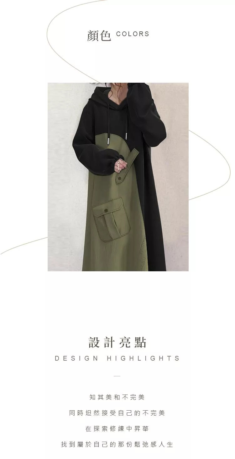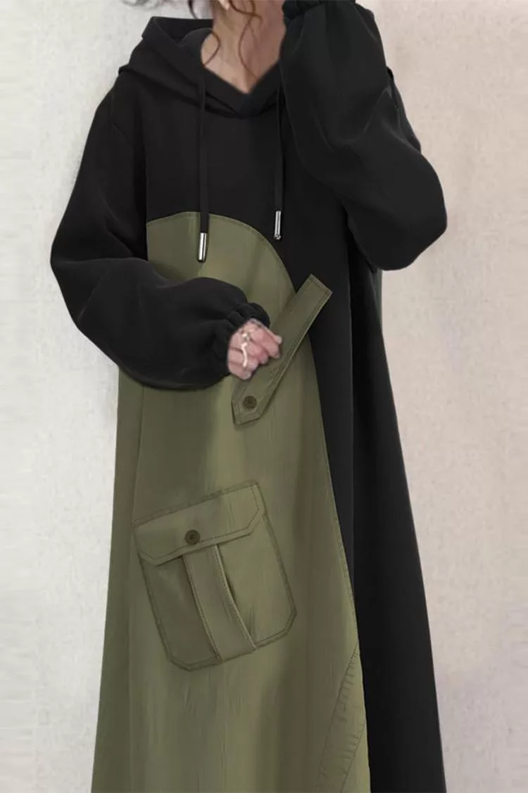 【初色】日系休閒寬鬆拼接撞色蓋口袋連帽抽繩長袖連帽中長裙連衣裙連身洋裝-黑色-39944(M/L可選) M 黑色