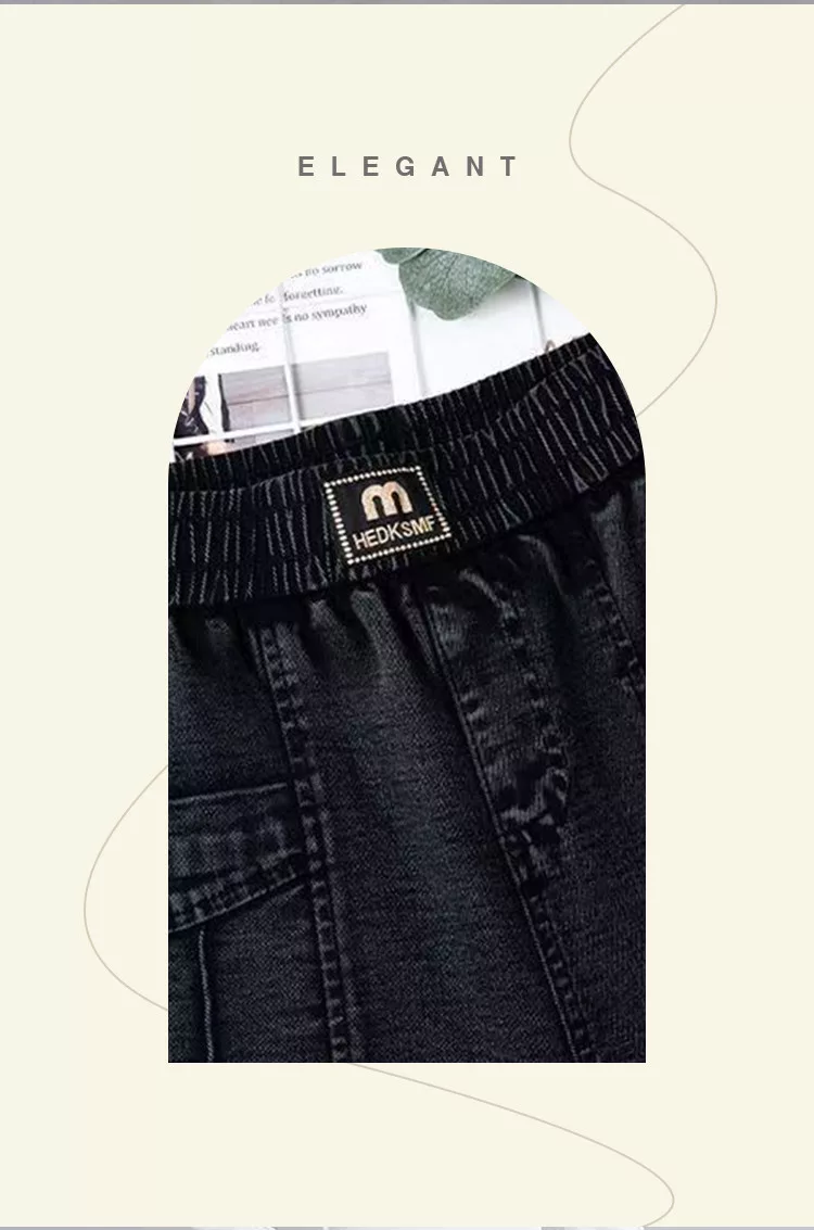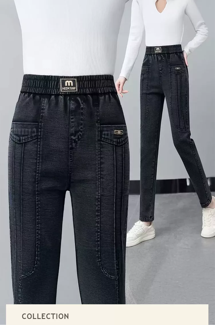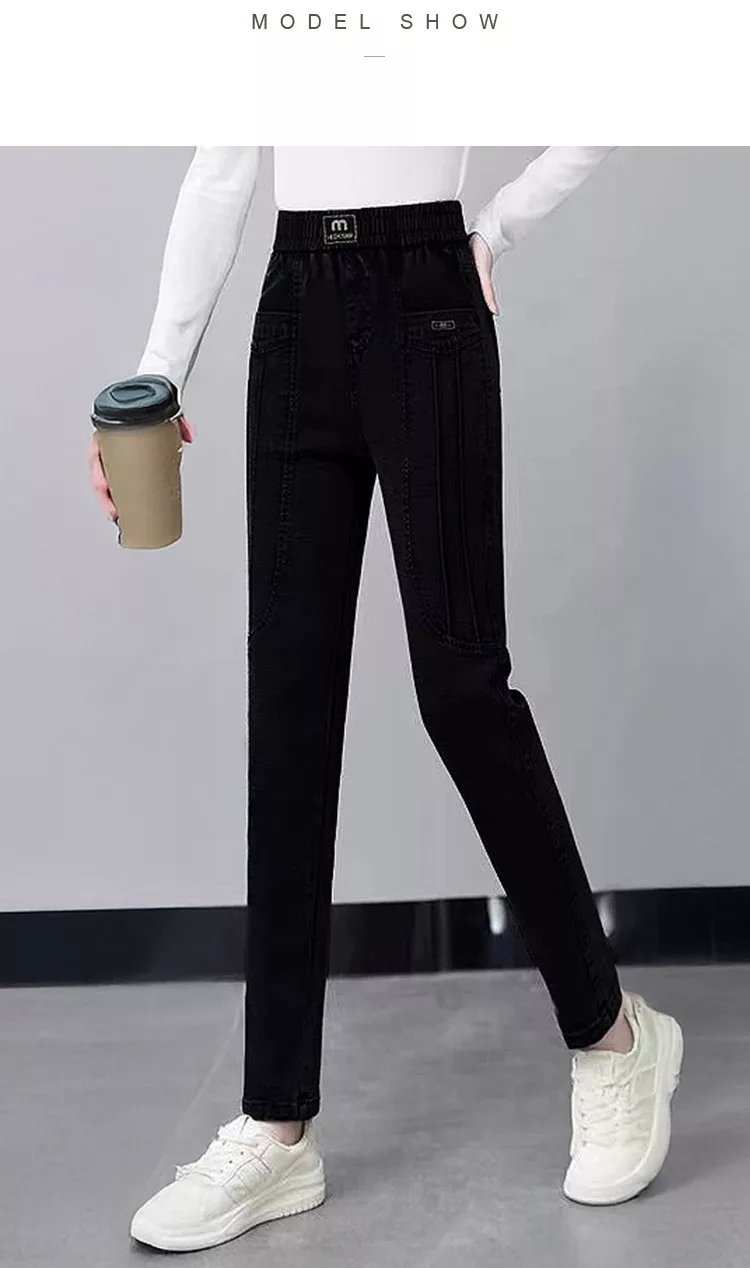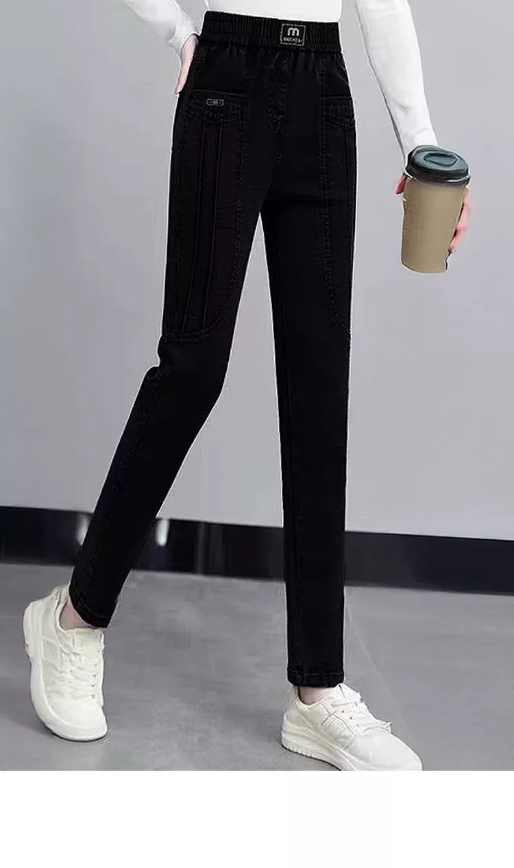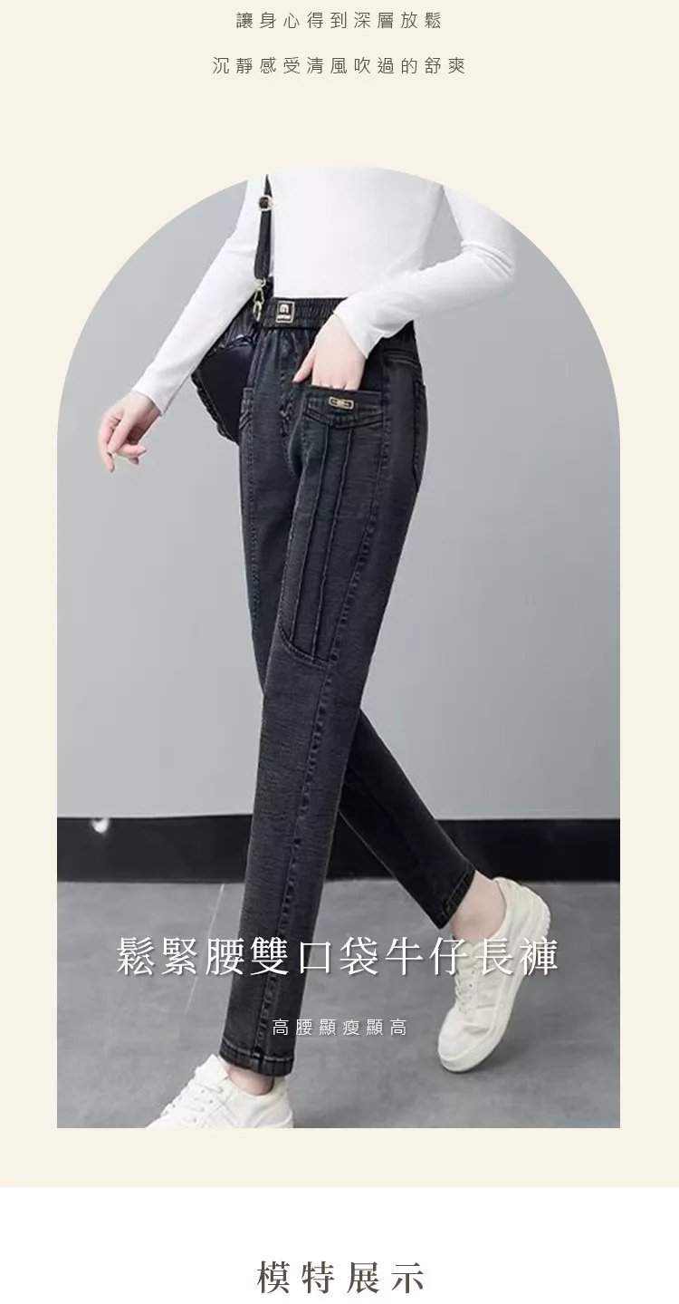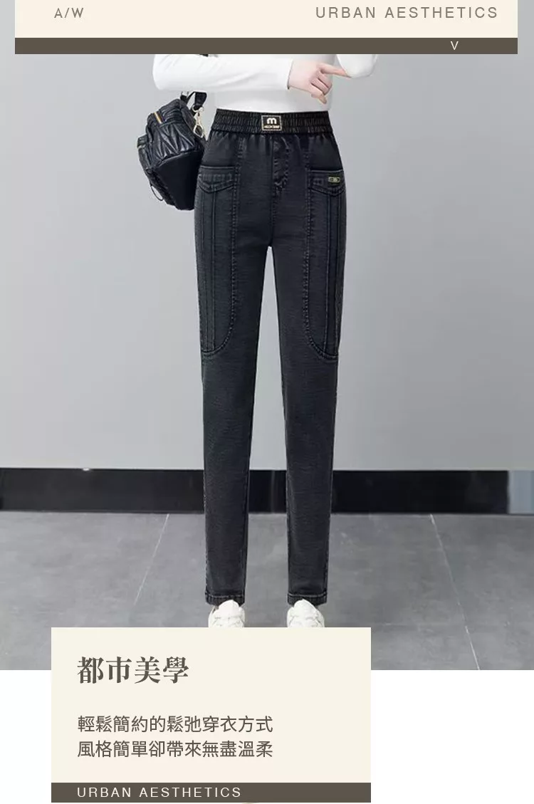 【初色】簡約加絨加厚保暖高腰鬆緊腰雙口袋休閒褲牛仔褲窄管褲長褲-共2色-16027(M-6XL可選) M 黑灰色加絨款