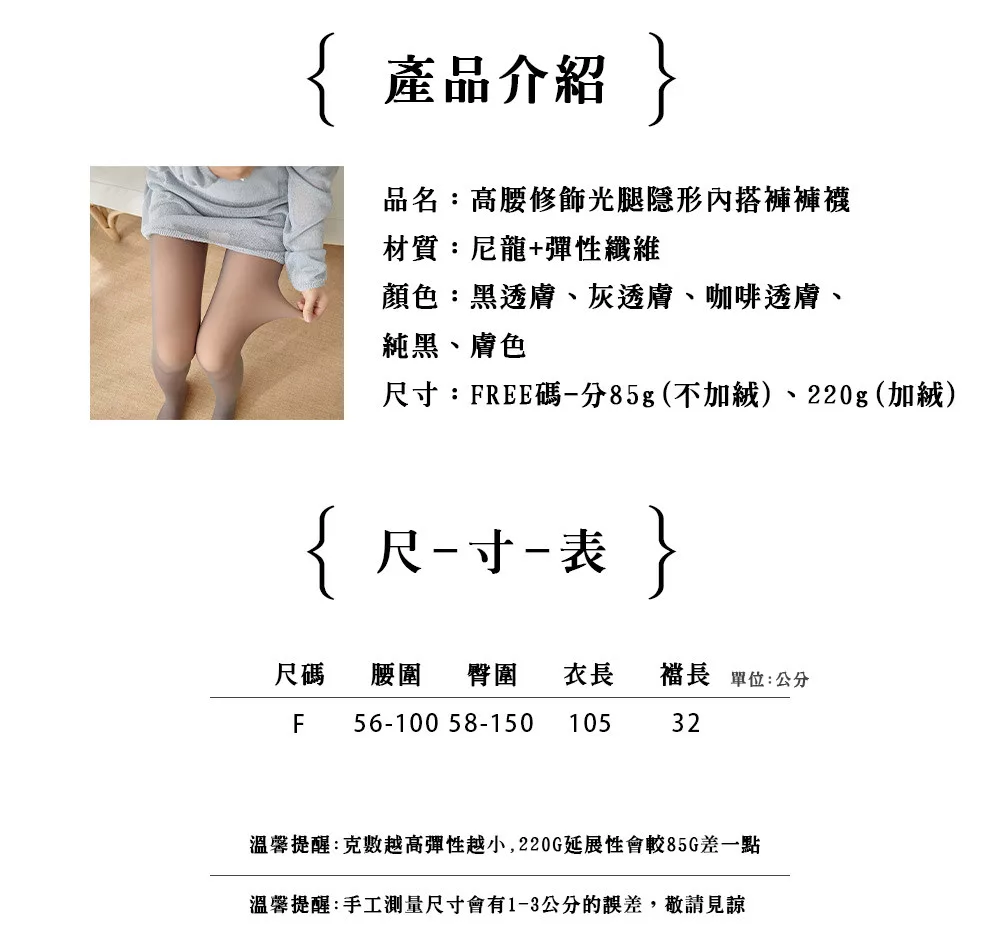 名稱:高腰修飾光腿隱形加絨內搭褲褲襪