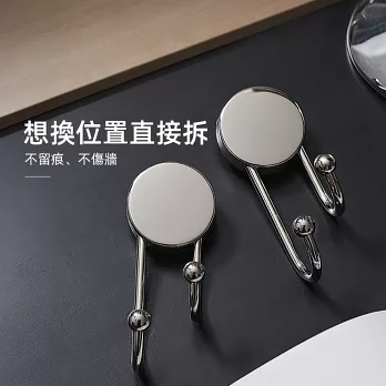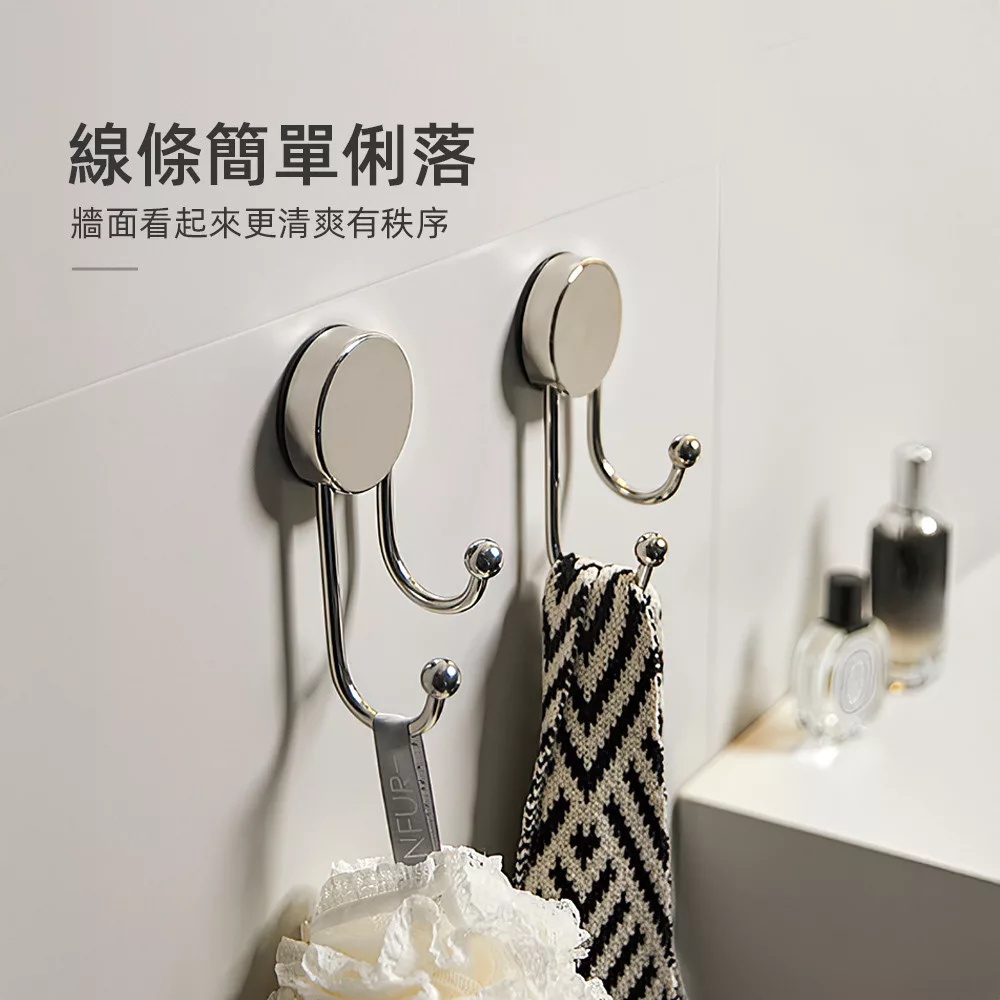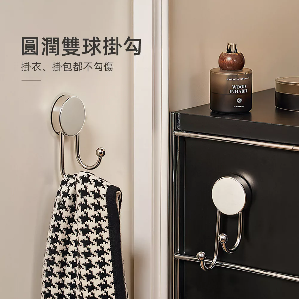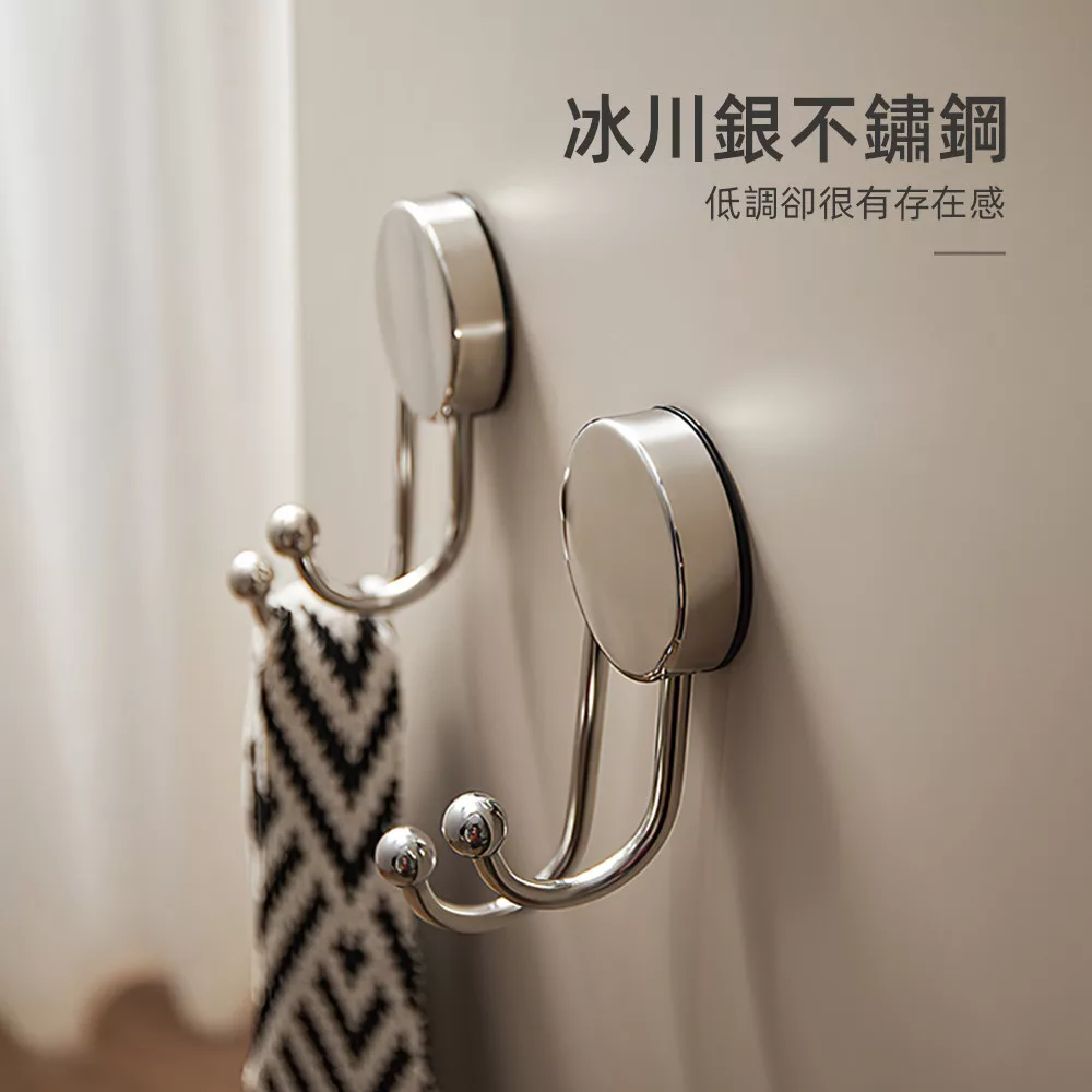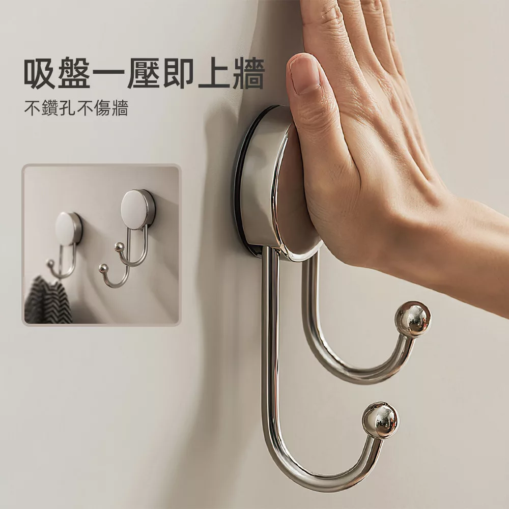 這款吸盤掛鉤採用冰川銀不鏽鋼材質,質感低調耐看;吸盤按壓即可上牆,不需打孔不傷牆面。圓潤雙球掛勾設計,掛衣物、毛巾或包包不易勾傷,日常收納更安心。