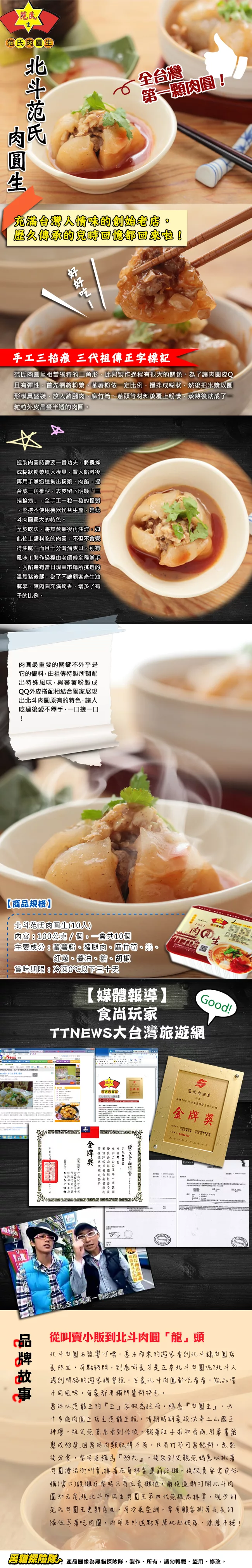 二粒北斗肉圓,配貢丸、豆腐湯,或唇齒留香『四神湯』,四、五十元,就一飽口福,北斗肉圓總是維持便宜好吃風味,滿足顧客胃口。當時以范龍生的『生』字做為註冊,稱為『肉圓生』,六十多歲肉圓生店主范龍生說,清朝時期家族供奉三山國王神壇,祖父范萬居看到信徒,餓著肚子求神看病,用蕃薯籤磨成粉漿,因當時肉類取得不易,只有竹筍可當餡料,煮熟後分食,當時是稱為『粉丸』,後來到父親范媽意以挑著肉圓擔沿街叫賣,接著在員林客運前設攤,後改奠安宮前俗稱(宮口)設攤在當時只有五家攤位,爾後逐漸打開北斗肉圓知名度,現北斗市區由肉圓生第四代范振忠接掌,現今的范氏肉圓生更新店面,有冷氣空調,常有顧客排著常常隊伍等著吃肉圓,或外帶每盒三百元的肉圓禮盒亦有各大購物網均有,宅急便配送。