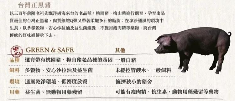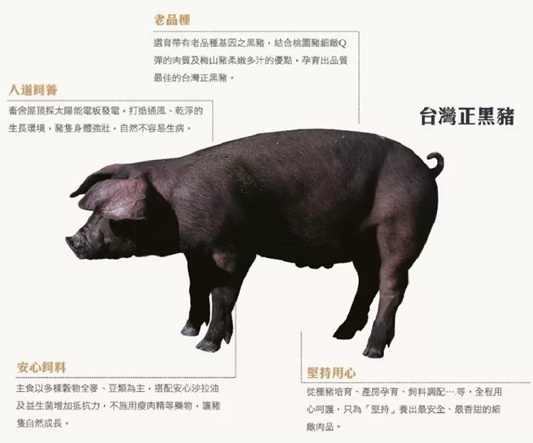 | 相信堅持的價值,尋找台灣真食物 老品種的台灣黑豬,擁有桃園豬的細緻Q彈肉質,梅山豬柔嫩多汁的脂肪優勢。堅持使用品種選育搭配全素飼料配方,飼養過程絕對不使用瘦肉精及抗生素,人道精神飼養給予豬隻通風環境及足夠的運動空間,定期幫黑豬沖澡,造就正黑豬獨特的風味與口感。 |