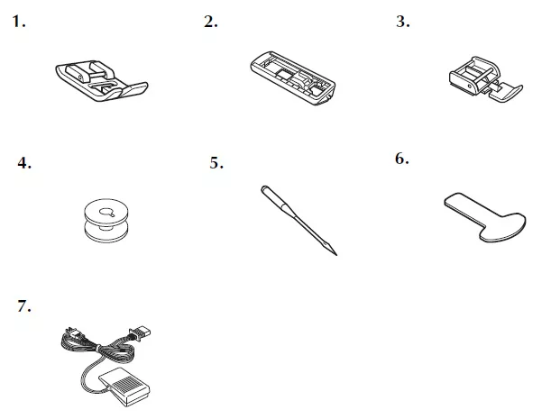 1.萬用壓布腳 2.四步驟開釦眼壓布腳 3.拉鍊壓布腳 4.梭子 5.車針(包) 6.起子 7.腳踏板 8.說明書