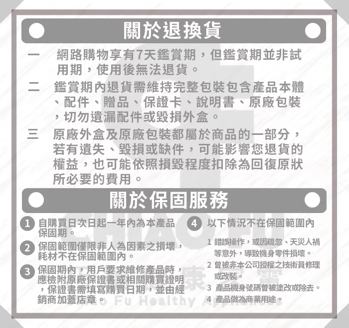 家電或3C商品涉及技術及專業,其保固及維修相關事宜仍應由該商品之原廠、代理商、製造商等進行專業之處置。若商品有保固及維修之需求,請依循原廠、代理商、製造商揭示之相應規範及流程處置,並配合提供產品序號和購買證明後依其指示進行。以商品瑕疵為由退換貨者,可代為受理將商品送原廠或代理商檢測(一般處理時間需2~3週,實際依各該品牌規範為準),若經檢測非商品本身瑕疵,恐無法退換貨。