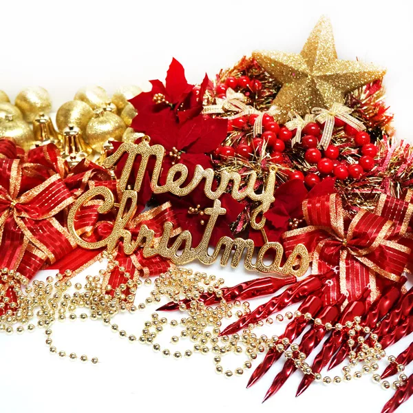 配件內容包括: 樹頂星 / Merry Christmas英文字 / 金蔥彩條龍柱/ 精緻蝴蝶結 / 金珠鍊/電鍍吊飾(例如鐘或冰柱等)/吊飾球等等 (共計80件配件)