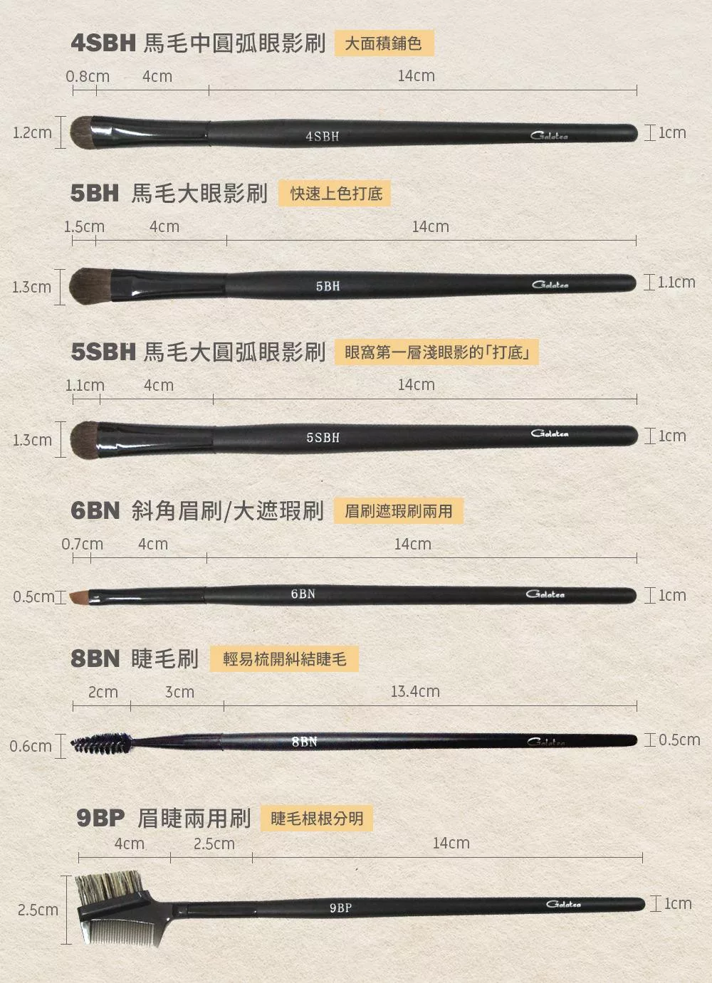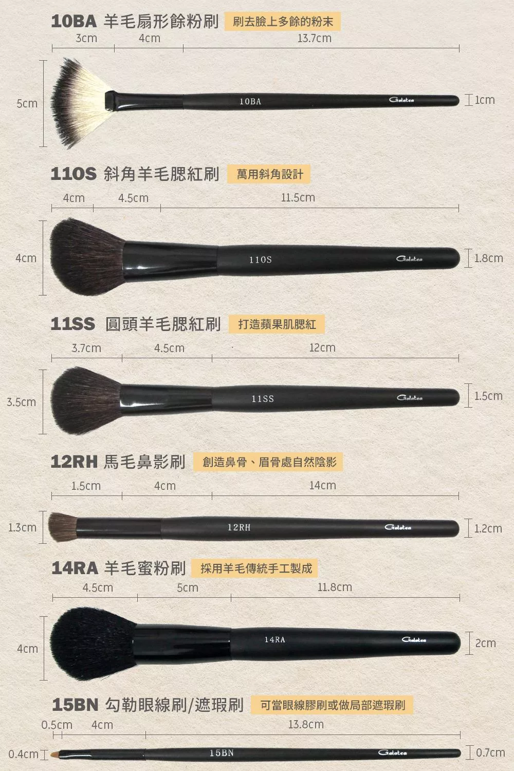 | 組合內容 | 蜜粉刷2支、餘粉刷1支、粉底刷1支、遮瑕刷1支、腮紅刷3支、大小眼刷11支、眉刷1支、唇刷1支 、眉睫刷2支,共23支基礎功能刷+刷套。 |