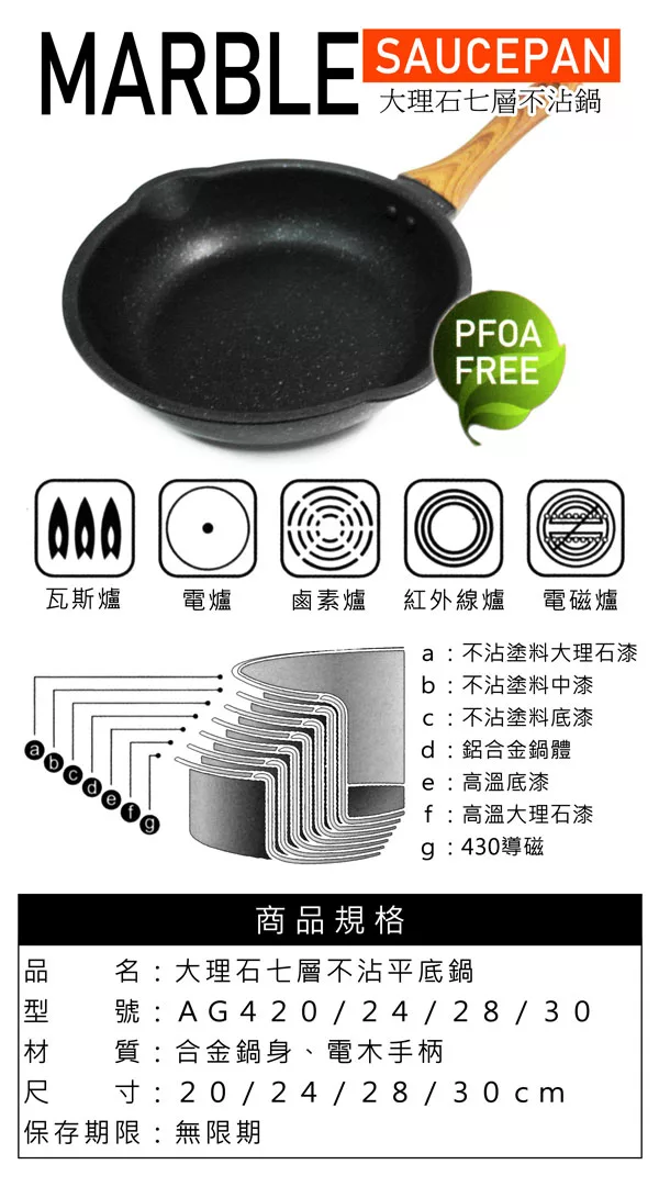 通過SGS材質檢驗標準,使用安心,採用日本okitsumo塗層,大理石不沾塗層,不留食物殘味,傳熱快速,極輕量七層導熱更均勻,儲熱性佳,料理食物好鍋具,瓦斯爐、電爐、鹵素爐、紅外線爐通通適用,IH電磁爐對應設計。