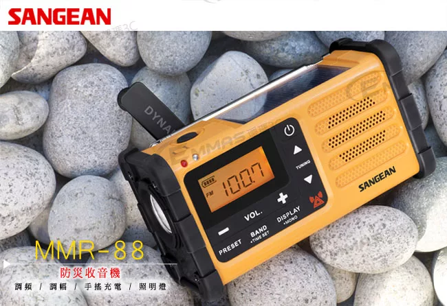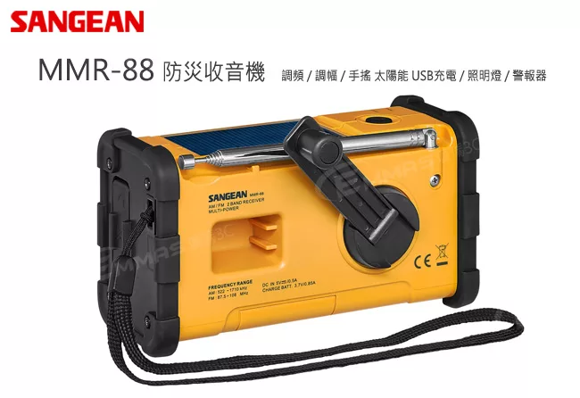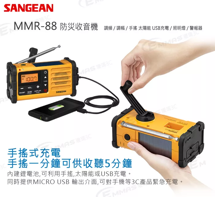 ■ 手搖式充電,手搖一分鐘可供收聽5分鐘