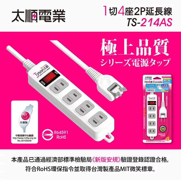 【太星電工】 一開四插延長線/2P 15A 9尺 總開關 過載保護 OEA41209 白色