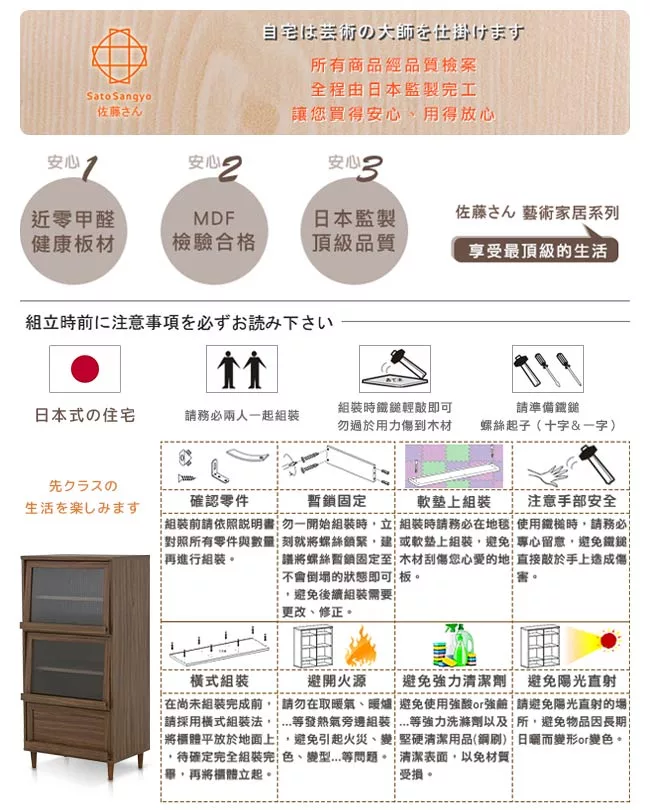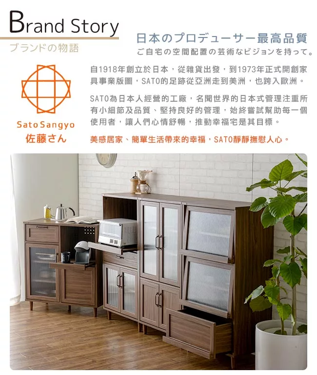 【Sato】日本品牌,職人精神的手工、講究獨特的細緻、質感上乘的細節、豐富變化品味極致,非凡大器。櫃面是高級木紋化妝紙面板、內部為蜂巢板材質,以精緻的設計和高品質的材質,打造出兼具品質與設計的雙重質感要求。加厚天板,耐荷重20kg,適合作為置物台使用。波浪玻璃的門面,提供收納的隱蔽性與時尚感。透著光的波浪玻璃,展現與眾不同的細膩格調,與胡桃木色門相輝映,看見科技與人文間的完美融合,美觀質感、優雅而耐用。上掀式門板設計,開關方便,順暢自如。門板的木製凹槽把手,可作為展示架與擺放物品,適合收納DVD、雜誌、口袋書⋯等,有效利用每一吋空間,讓抽屜的拉把不再只是開關,兼具收納與裝飾的效果,隨四季變換調整收納擺飾。抽屜與拉門的使用有種慢節奏的復古情懷,之於空間的思考上,不再遵循傳統的分隔式設計,將客廳、餐廳、書房串起高度的互動交流可能。