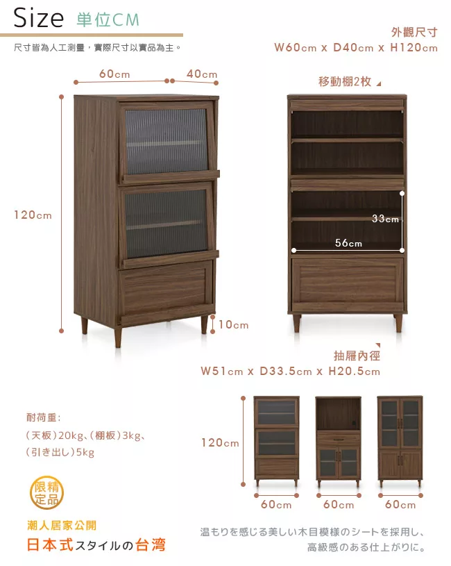 正統日本復古設計,雙掀門置物空間與下方抽屜,多樣的收納功能,可擺放各式各樣的物品。可調式層板設計,可調整置物空間的大小,方便收納各式碗盤鍋具。滾輪式滑軌,輕鬆流暢的開闔抽屜。實木圓腳,穩固櫃體、經久使用。挑高腳座設計,可隔離濕氣,方便清潔打掃。防刮腳墊,防刮傷地板。在細節處處用心,充分顯現當代設計簡約俐落但又極具設計美感魅力的精髓。
