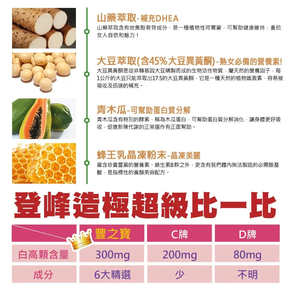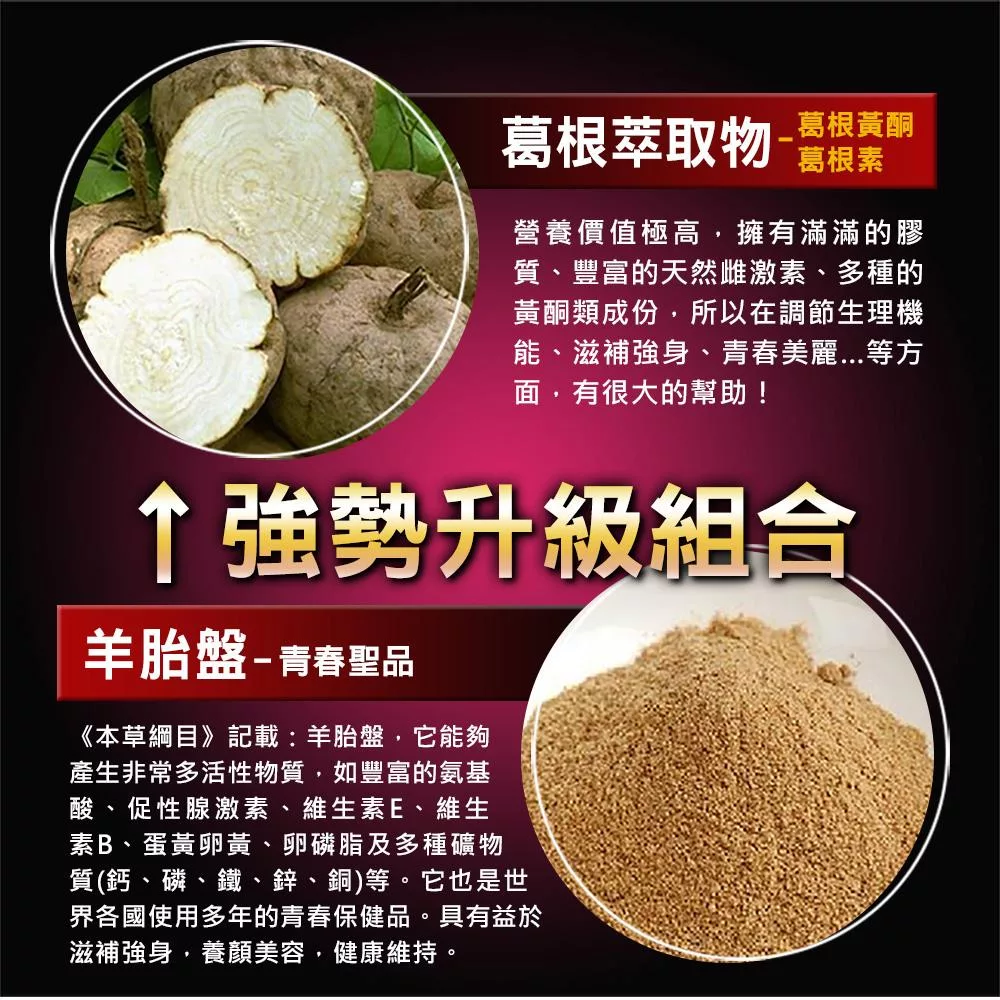 | 商品成分 | 葛根萃取粉(葛根萃取物、麥芽糊精)、麥芽糊精,羊胎盤粉(羊胎盤粉、麥芽糊精、氯化鈣),蜂王乳 |