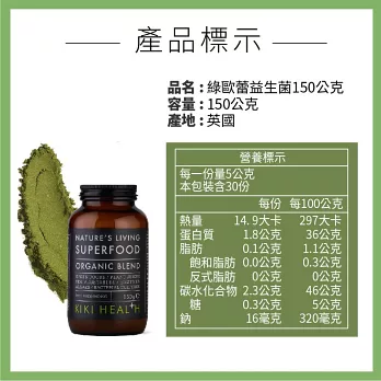 Ingredients: Land Vegetables:Nettle Leaf, Wheat Grass, Barley Grass, Horsetail, Alfalfa Grass Juice, Carob, Burdock Root, Ginger Root, Nopal Cactus, Barley Grass Juice, Wheat Grass Juice, Oat Grass Juice, Dandelion Leaf, Parsley Leaf, Kale, Broccoli, Cabbage, Amla Fruit.Algaes:Spirulina, Chlorella (Broken Cell Wall).Sea Vegetables:Kelp, Fucus Vesiculosus.Enzymes:Lipase*, Cellulase*, Protease*, Amylase*, Bromelain*, Papain*.Bacterial Cultures:Bacillus Subtilis*, Bacillus licheniformis*, Lactobacillus Acidophilus*,Lactobacillus Casei*, Lactobacillus Plantarum*, Lactobacillus Rhamnosus*, Lactococcus Lactis*, Bifobacterium Bifidum*.