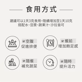 使用方法:成人攝入量可以從每日2g開始,根據生活習慣逐漸提升為1匙或更多。可以搭配果汁或水食用,或者加在食物中也可以。