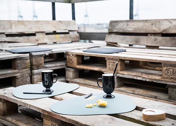 丹麥新興傢飾 LIND DNA 運用皮件製程中產生的角料,切割後與天然橡膠重新複合製成桌墊。此材質更加環保而節約資源,是傳統皮革的替代品;得益於其中 20% 的橡膠含量,再生的皮革桌墊防水防塵,便於清潔且耐用。
