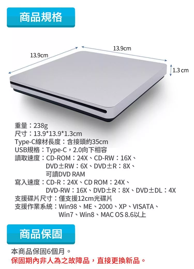 【Type-C接頭 CD DVD讀寫燒錄 光碟機】燒錄機 外接 吸入式 Combo 適用MacBook 銀