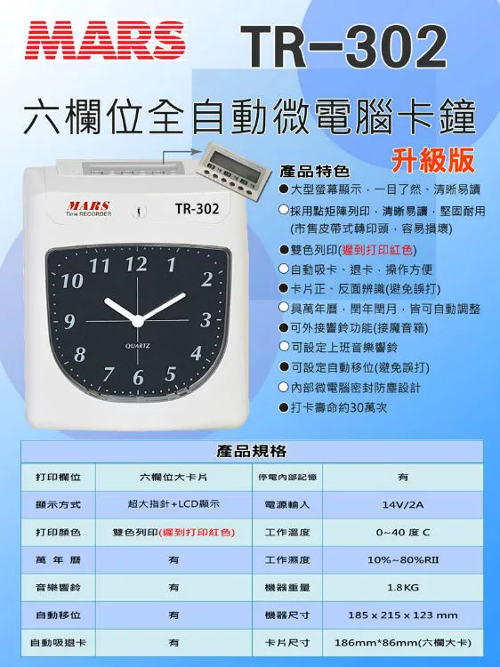 VERTEX TR-301 六欄位指針打卡鐘+贈卡片100張+卡架10人份