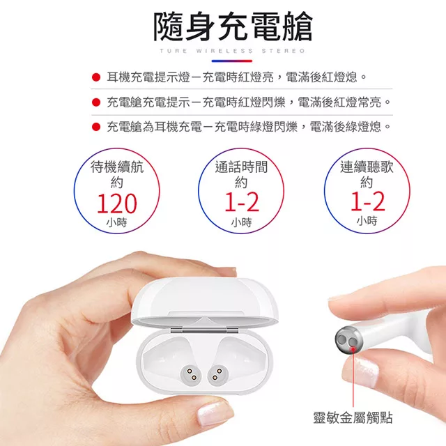 產品內容物:充電艙*1、耳機*2、充電線*1、矽膠保護套*1、掛鉤*1