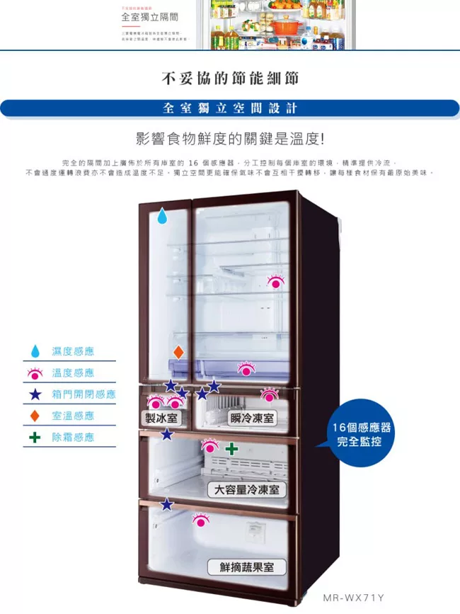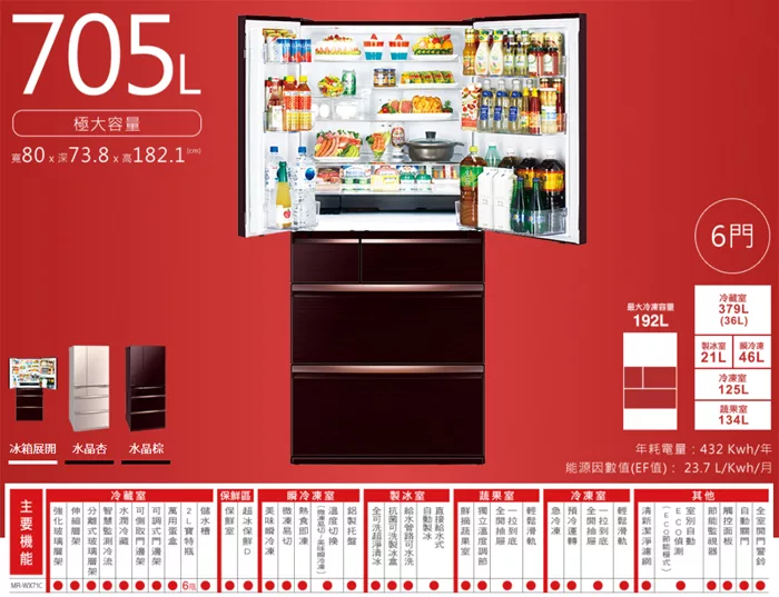 三菱705L日本原裝變頻六門電冰箱MR-WX71C水晶杏