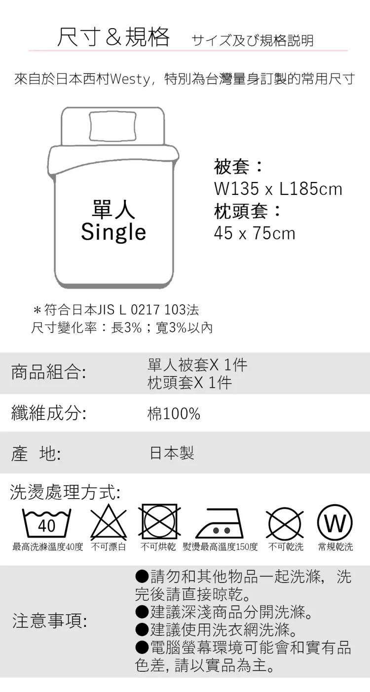 【尺寸】單人被單135x185cm, 枕頭套45x75cm, 單人床包(單)105x186x25cm