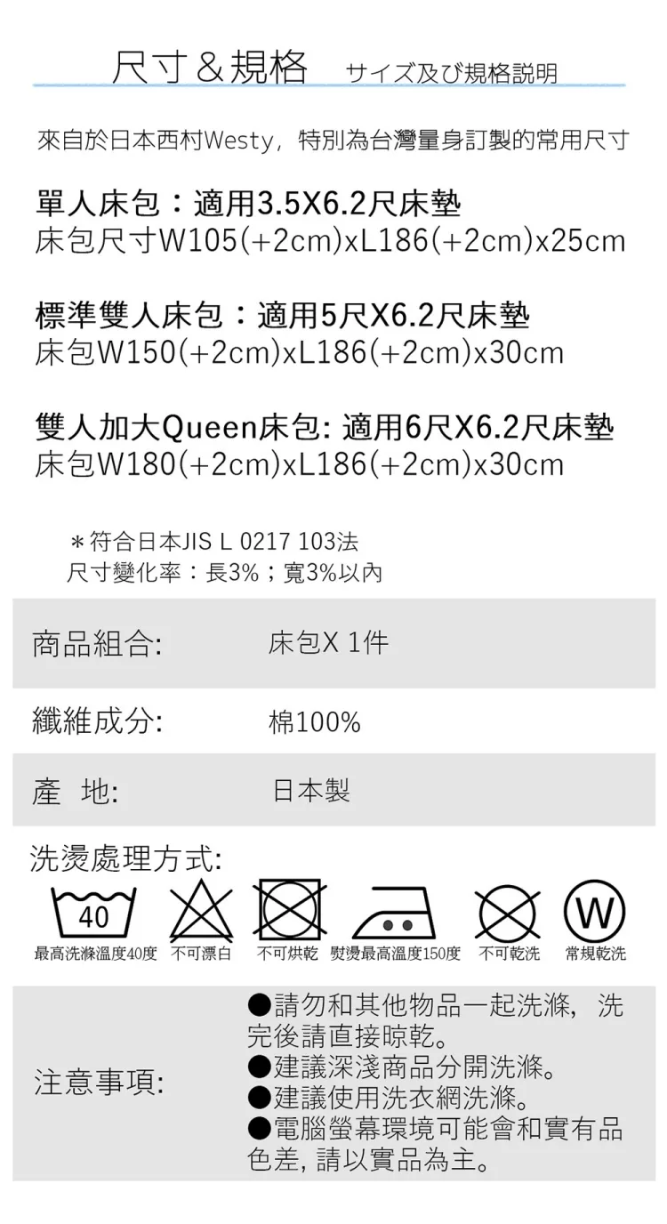● 本品牌每件商品都是依據台灣大眾尺寸而客製設計生產, 因床墊有歐規/日規/美規而有差異, 請下單前, 先行確認家中使用的床墊尺寸可以適用再下單, 請恕無法因為尺寸不合而退換貨, 謝謝!