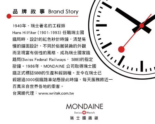 1940年,瑞士著名工程師Hans Hilfiker (1901-1993),運用自身鐵路工作經驗,將鐵軌化為清晰易讀的時間刻度、站務員慣用的紅色蕈形木棒做為秒針,完美結合傳統與現代,創造出極端簡潔卻富有個性的鐘面,成為瑞士國家鐵路局Swiss Federal Railways的指定計時器。如今在瑞士國內超過所有火車站及各國著名地標,皆能見到它的蹤影。