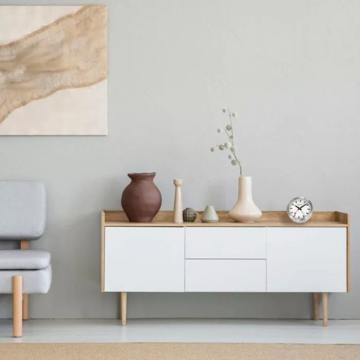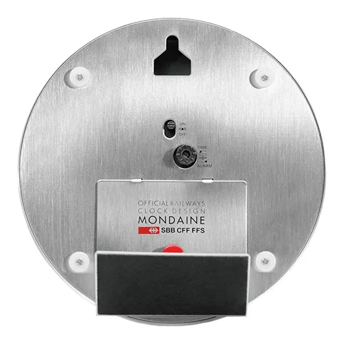 MONDAINE 瑞士國鐵兩用鬧鐘,一貫清楚易讀的鐘面設計,附有鬧鈴功能。恰好的尺寸,可以懸掛在面積較小的牆柱或房間,或使用隨附的L型鋁合金支架,立於桌面作為桌鐘使用,時時刻刻給您最準確的計時。