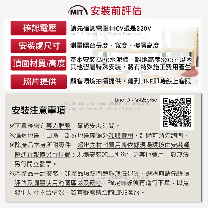 ◎本產品一經安裝,非產品瑕疵問題恕無法退貨,選購前請先謹慎評估及測量使用範圍區域及尺寸,確定無誤後再進行下單購買,以免發生尺寸不合情況。若有疑慮加入LINE ID:@425brlse諮詢。