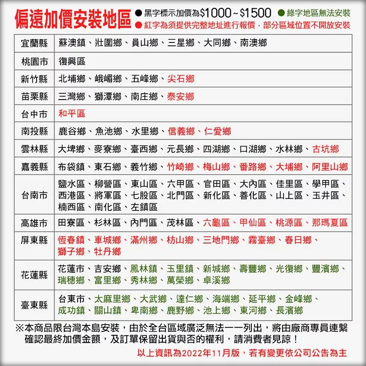 ◎除產品本身所附零件安裝外,超出之材料費用將依據現場環境由安裝師傅評估後報價費用另計;現場安裝施工所衍生之其他費用,恕無法另行開立發票。