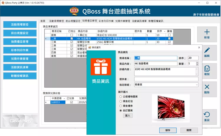 ● 可自訂獎項名稱、獎品內容、獎項排序、獎品圖檔等。