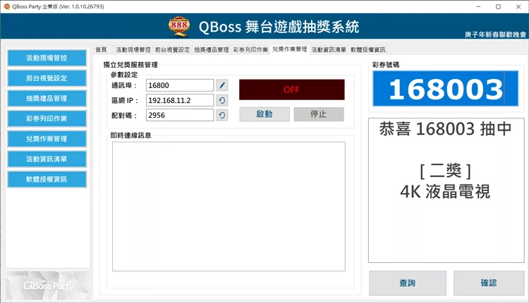 ● 內建中獎資訊輪播功能,可另行投影至輔助螢幕或投影機。