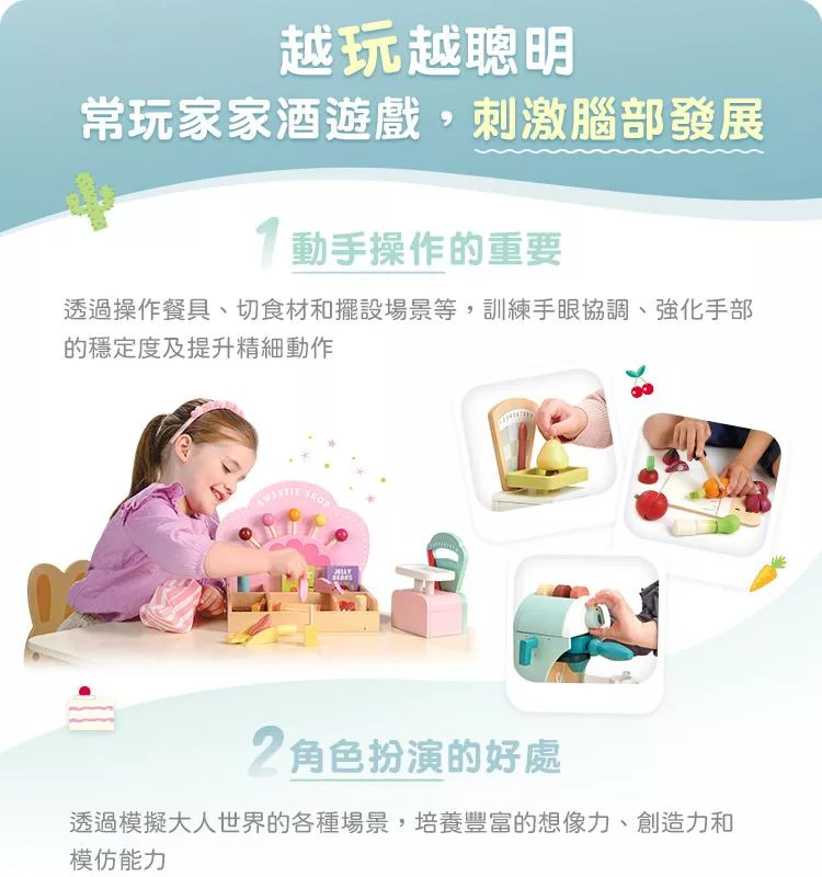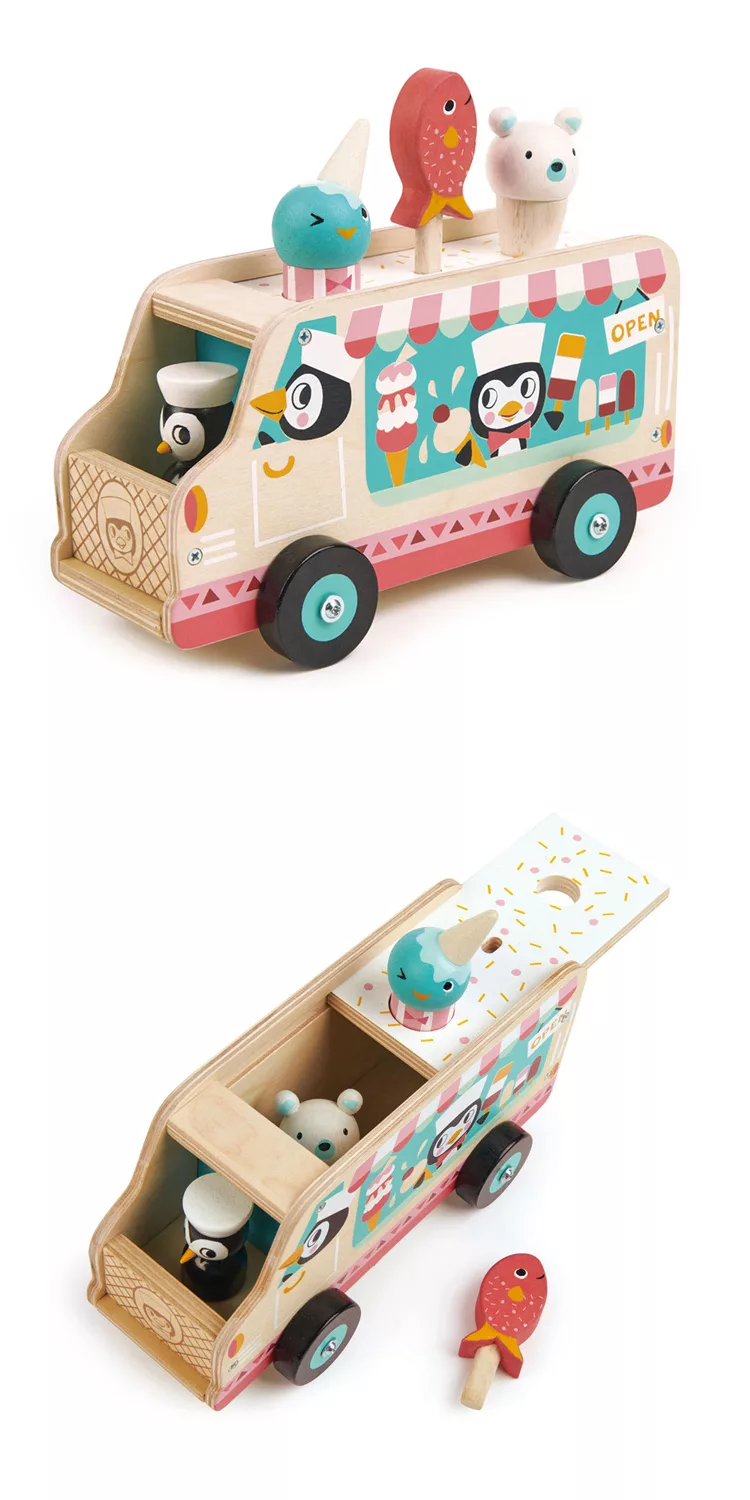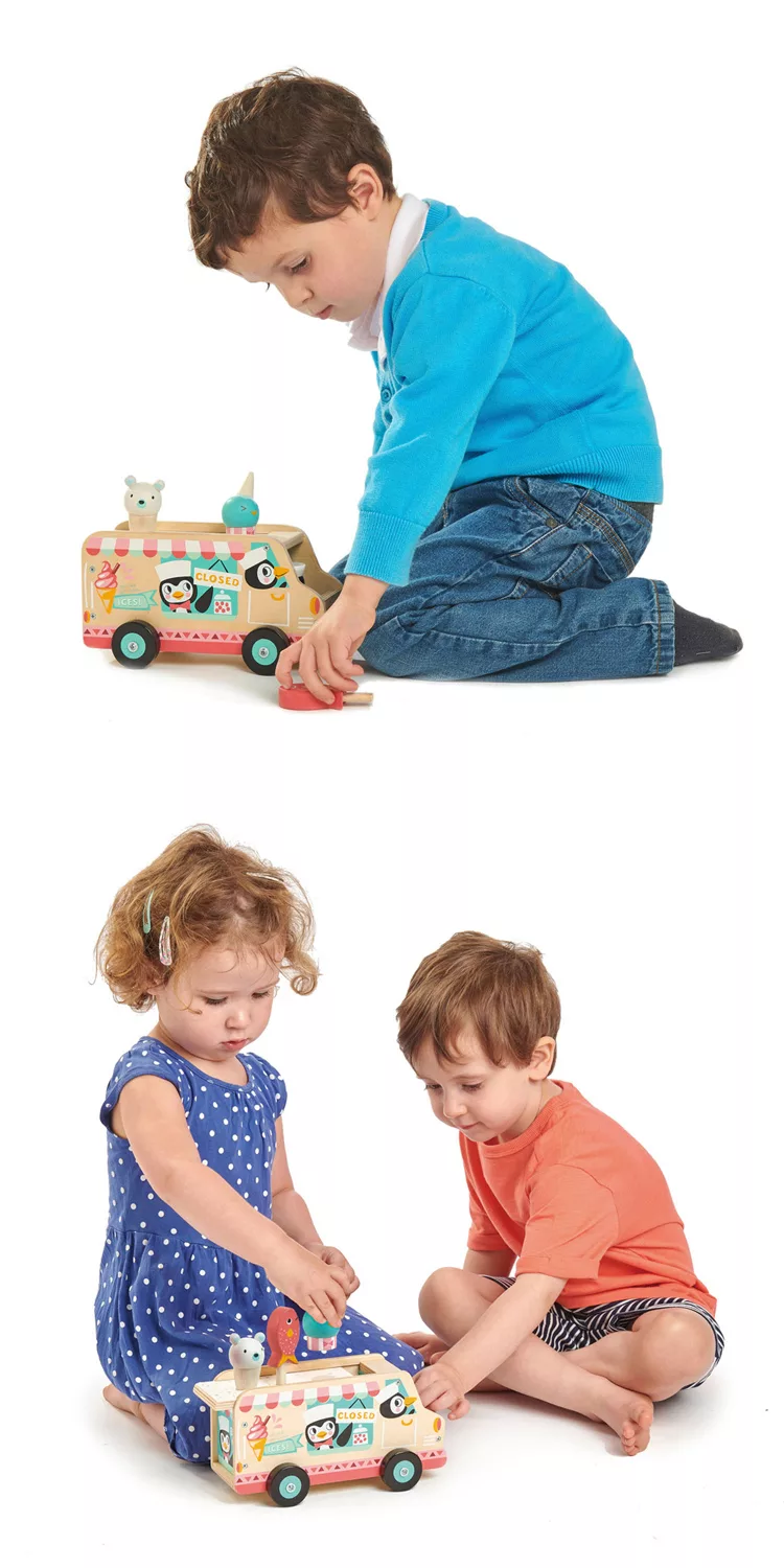 認識冰淇淋車的功用建構生活認知。 遊戲中融入生活情境激盪應變能力。 擁有置物空間的車體設計豐富遊戲。