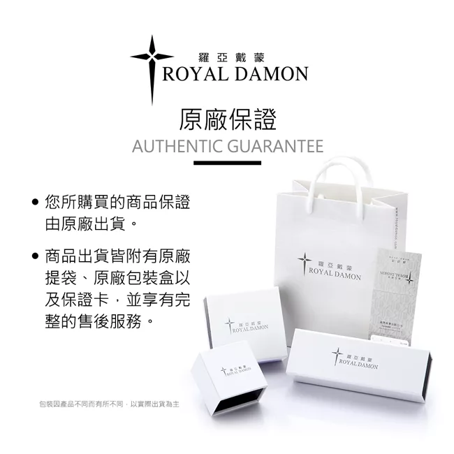 商品配件:附 Royal Damon 專屬包裝盒、提袋、原廠飾品保證卡。