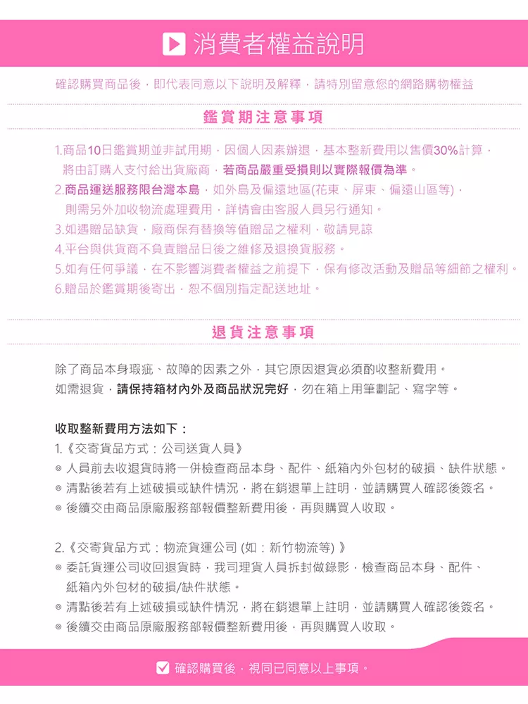 當您於此頁面下單表示您了解並同意下述規範,請注意!
