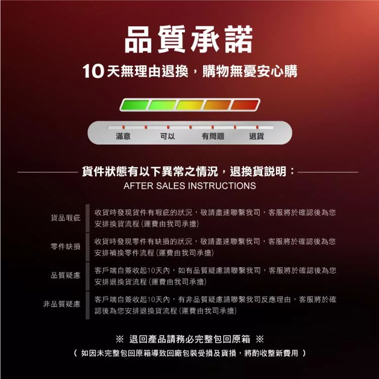 辦理退換貨時,商品必須是全新狀態與完整包裝(請注意保持商品本體、配件、贈品、保證書、原廠包裝及所有附隨文件或資料的完整性,切勿缺漏任何配件或損毀原廠外盒)。退回商品無法回復原狀者,恐將影響退貨權益或需負擔部分費用。
