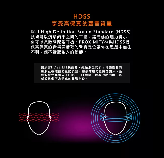 HDSS聲學設計帶來高保真的聲音質量,讓你真正的沉浸在音樂或遊戲中的空間。
