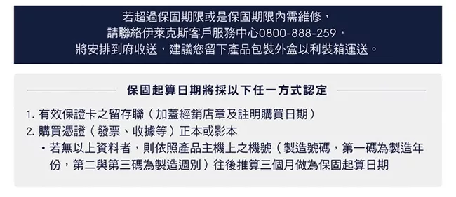 家電或3C商品涉及技術及專業,其保固及維修相關事宜仍應由該商品之原廠、代理商、製造商等進行專業之處置。若商品有保固及維修之需求,請依循原廠、代理商、製造商揭示之相應規範及流程處置,並配合提供產品序號和購買證明後依其指示進行。以商品瑕疵為由退換貨者,可代為受理將商品送原廠或代理商檢測(一般處理時間需2~3週,實際依各該品牌規範為準),若經檢測非商品本身瑕疵,恐無法退換貨。