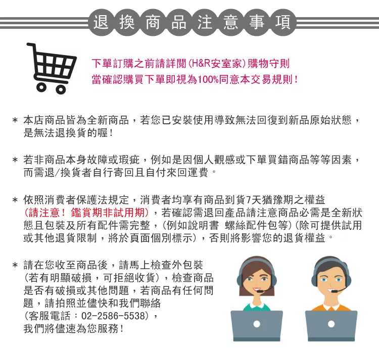 ※退換貨之商品必須是全新狀態且包裝完整,請保持商品及內外包裝(紙箱、防塵塑膠袋和相關配件等)之完整性,若未保持完整恕無法提供退換商品服務。