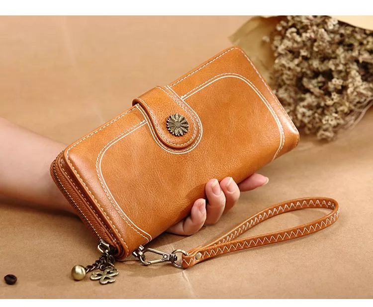 CHENSON真皮 12卡風琴卡層包覆式長夾(W21425-K) 杏