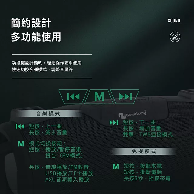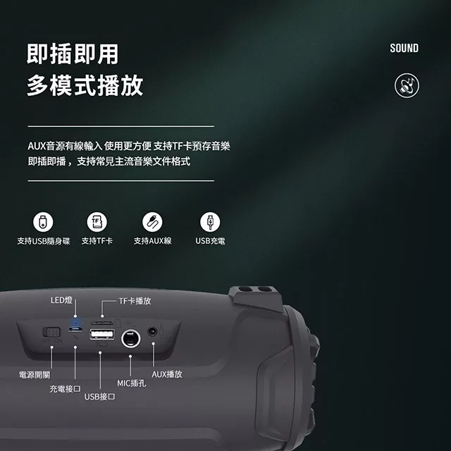 ◎ 藍牙、USB隨身碟、TF卡、AUX、FM多種模式