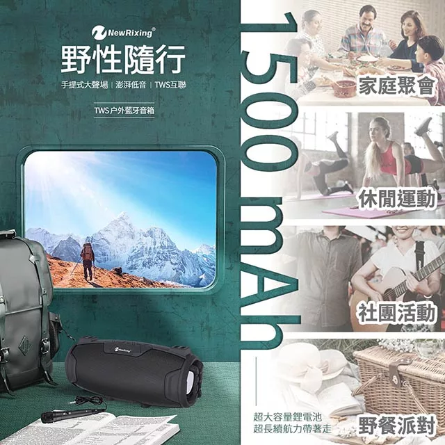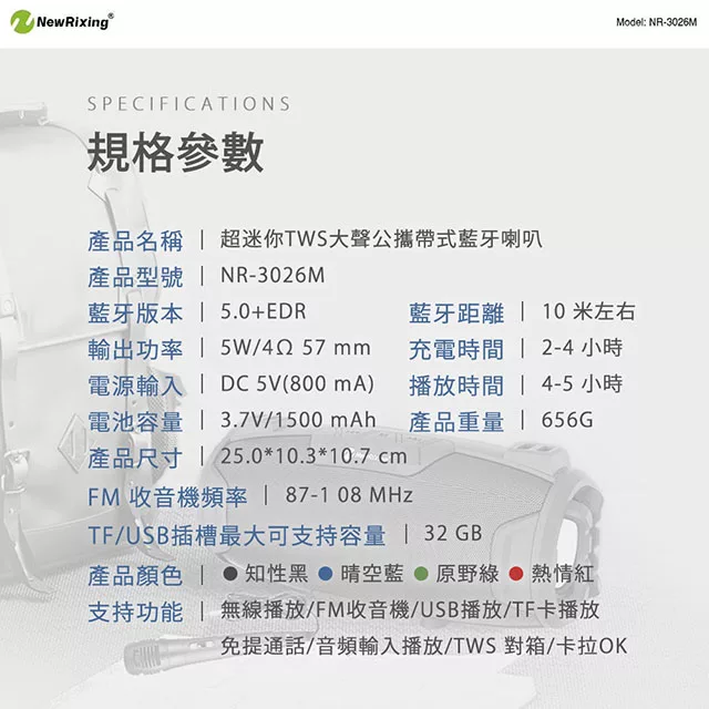 產品內容物:藍牙音響x1、USB充電線x1、說明書x1、麥克風含線x1組、背帶(100公分)x1
