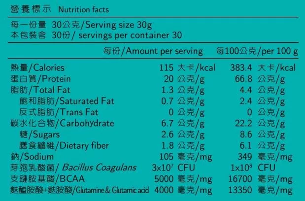 成份:濃縮乳清蛋白(濃縮乳清蛋白、大豆卵磷脂)、分離乳清蛋白(分離乳清蛋白、大豆卵磷脂)、麥芽抽出物、菊糖、鹽、芽孢乳酸菌、木瓜萃取物(麥芽糊精、乳糖、木瓜萃取物(含木瓜酵素))。