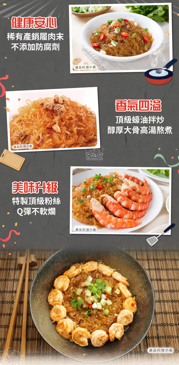 使用擁有產銷履歷的豬肉末與頂級蠔油拌炒,再加入古法熬製的金黃大骨高湯讓粉絲吸附濃郁美味,除了可以單獨成為一道佳餚外,也能與海鮮或牛肉、雞肉及8864豬肉搭配成為海鮮粉絲煲或是牛肉粉絲煲。總舖獅建議您可以先將海鮮或肉品以蔥蒜等配料爆香,若喜歡辣味也能加入適量辣椒唷! 再將撕開包裝後的粉絲煲倒入一起拌煮,待湯汁快收乾時關火放置約兩三分鐘,粉絲會將剩餘湯汁吸附,在家也能享用頂級的美食唷。