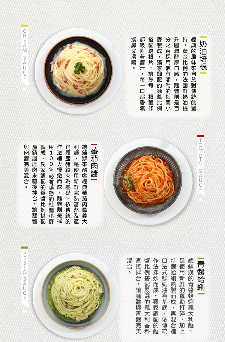 (此商品預設口味為:青醬蛤蜊x2、蕃茄肉醬x2、奶油培根x2,口味數量如需調整請於訂單備註)