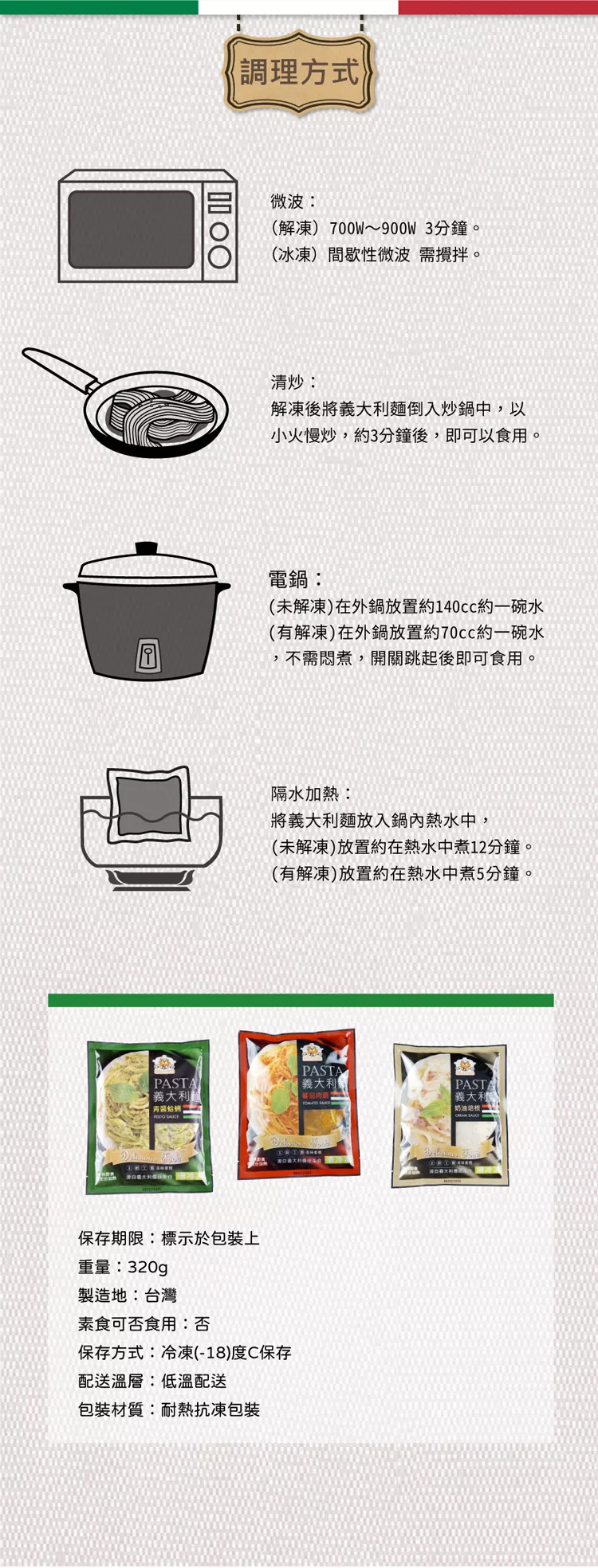 電鍋:(解凍)將義大利麵倒入碗中,外鍋半杯水,不需悶煮,開關跳起後即可食用(或直接將包裝置於內鍋隔水加熱,內鍋清水滿過包裝即可)