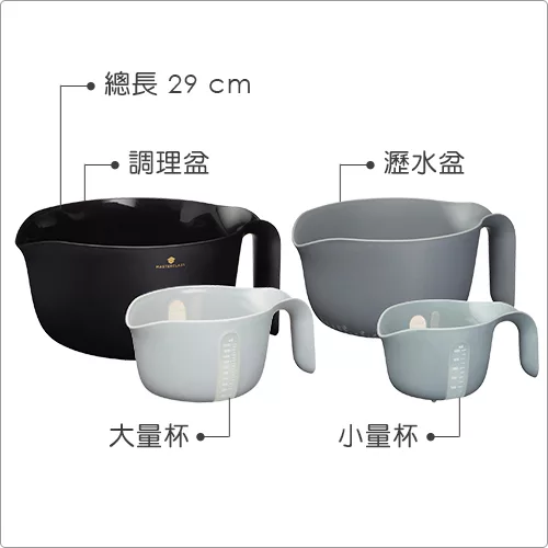 尺寸:小量杯長 19.5 x 寬 12 x 高 9.2 cm、大量杯長 22 x 寬 15 x 高 10.5 cm、瀝水盆長 25.5 x 寬 19 x 高 13 cm、調理盆長 29 x 寬 22.5 x 高 15 cm