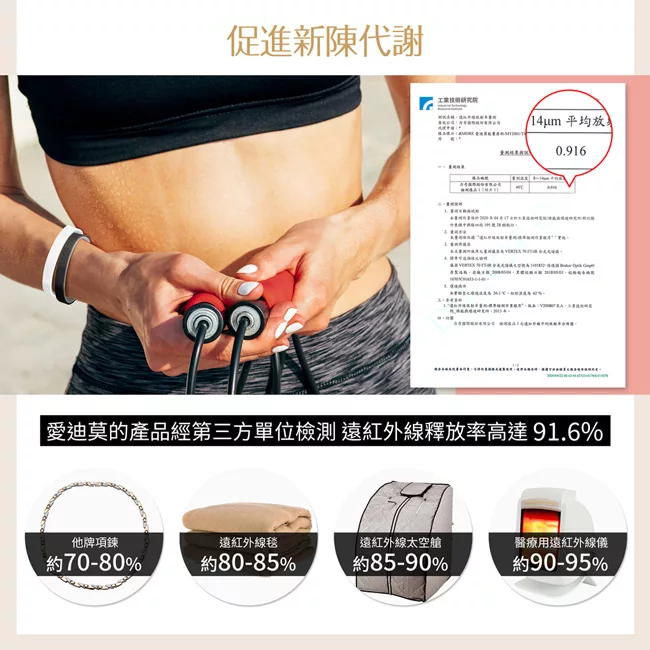 手環內含高濃度超微鈦鍺能量粉末,可穩定釋放高達96%的遠紅外線,促進血液循環與新陳代謝。持續配戴消除疲勞,進而達到深層放鬆、舒緩壓力的效果。即使在高壓環境、長時間久坐循環不好、運動過後乳酸堆積,都能感受到身體回復輕鬆的節奏。