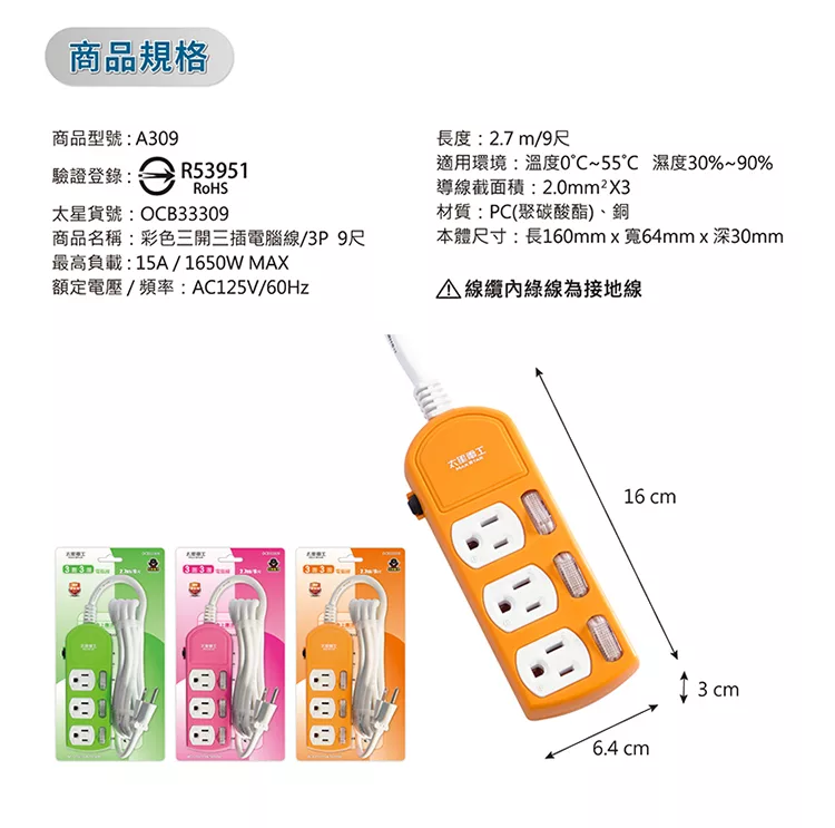 【TATUNG大同】4開3插3P 2.7公尺電源延長線(EN3-43C66NF-B7)