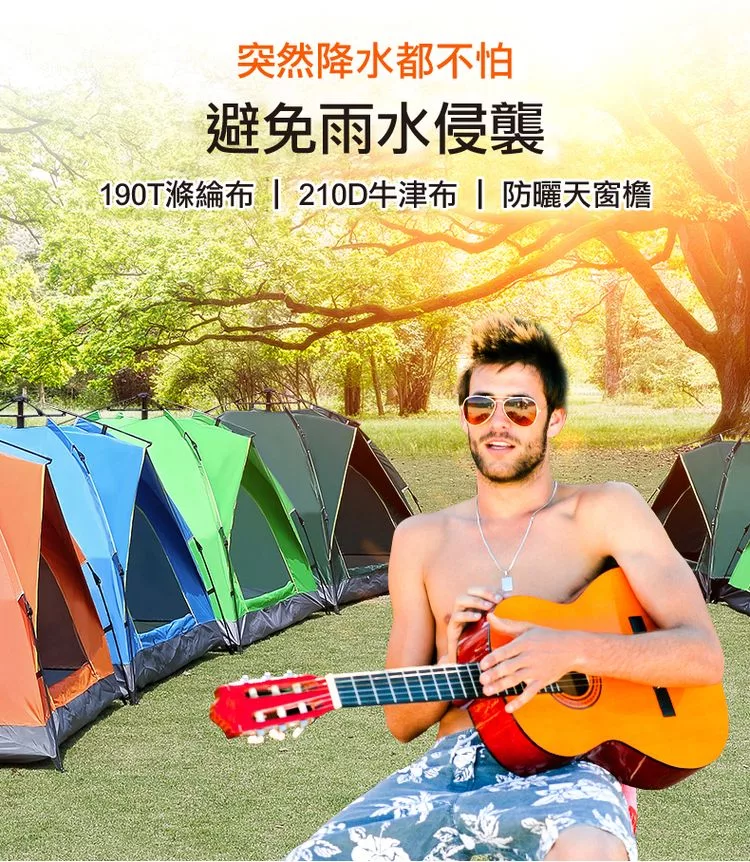 內容:帳篷x1+帳篷收納袋(顏色隨機)x1+防潮墊x1+防風釘x4+防風繩x4