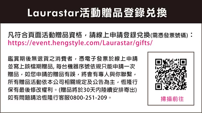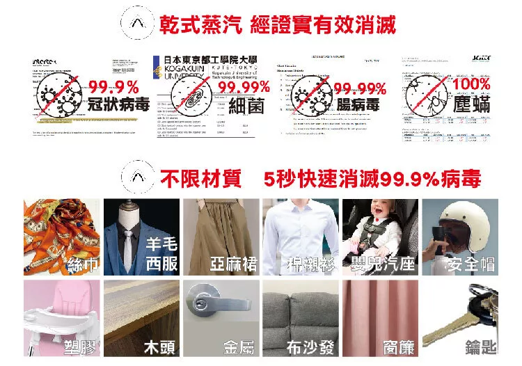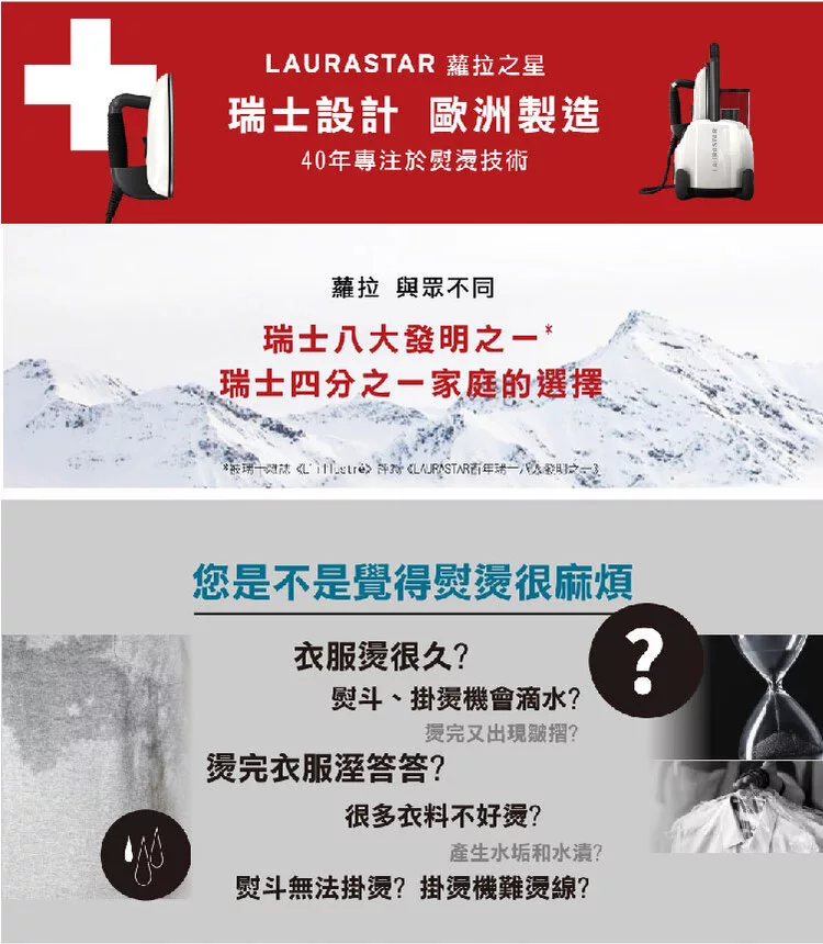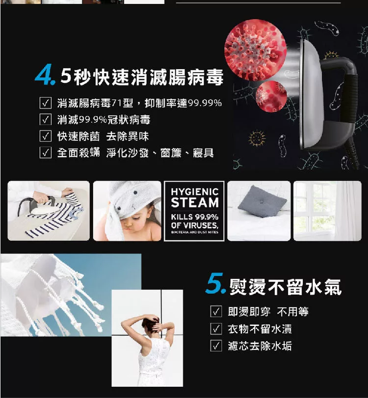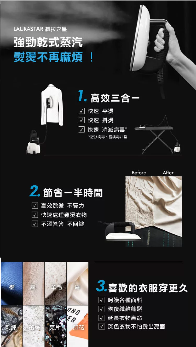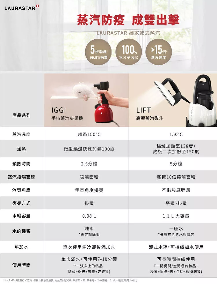 * 註1:「經台灣獨立實驗室的試驗結果顯示:LAURASTAR高壓蒸汽熨燙系統的乾式蒸汽,5秒能有效消滅